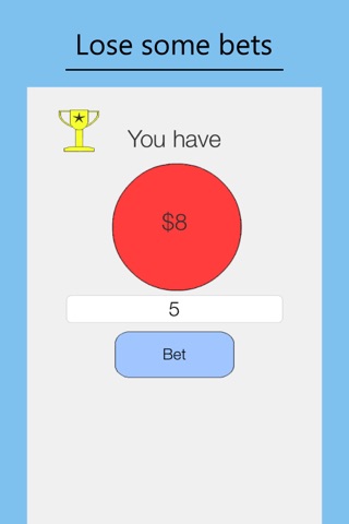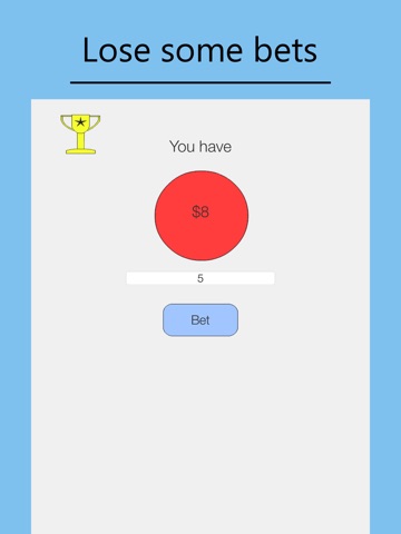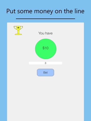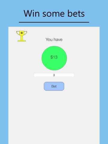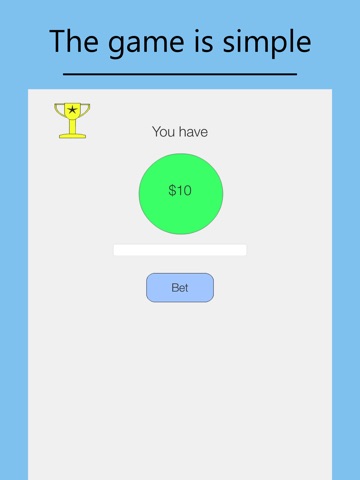 Find out in this simple, fun, and addicting game where you can make more money than you can dream of! But dont stop there. Keep betting and betting until one day you get the nerves to bet it ALL and... YOU MAKE EVEN MORE MONEY!!! But dont let that stop you! Keep betting it ALL and keep hoping you will never lose your bets and you will become richer than the entire world! Just check the leaderboard every once and a while to make sure youre still on top. Download today!