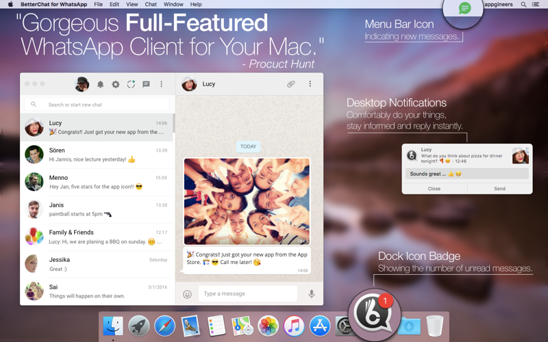 Basically bought everything on the appstore to try and find the best desktop solution for Whatsapp. Disappointed by all of them for one reason or another - no keyboard shortcuts, no ability to send audio, etc. Got frustrated enough that I started purchasing apps without any existing reviews, and these guys did it! Best of the bunch, beats the free WhatsChrome as well. Only thing Id love are keyboard shortcuts to move up and down conversations, but command+f and command+n alone do most of the job already. Great work.