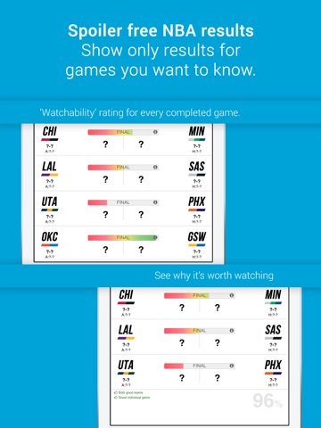 Spoiler-free Basketball helps you decide which NBA games you want to watch without spoilers. The app gives each game a watchability rating with reasons to watch or not. Because you can turn scores on and off for individual games, you can explore some games now while saving others for later. Not sure if a game is worth watching? Explore it quickly in Play by Play, then pick up the game when it starts getting interesting. Set game alerts and always be notified when a game is close or watchable.