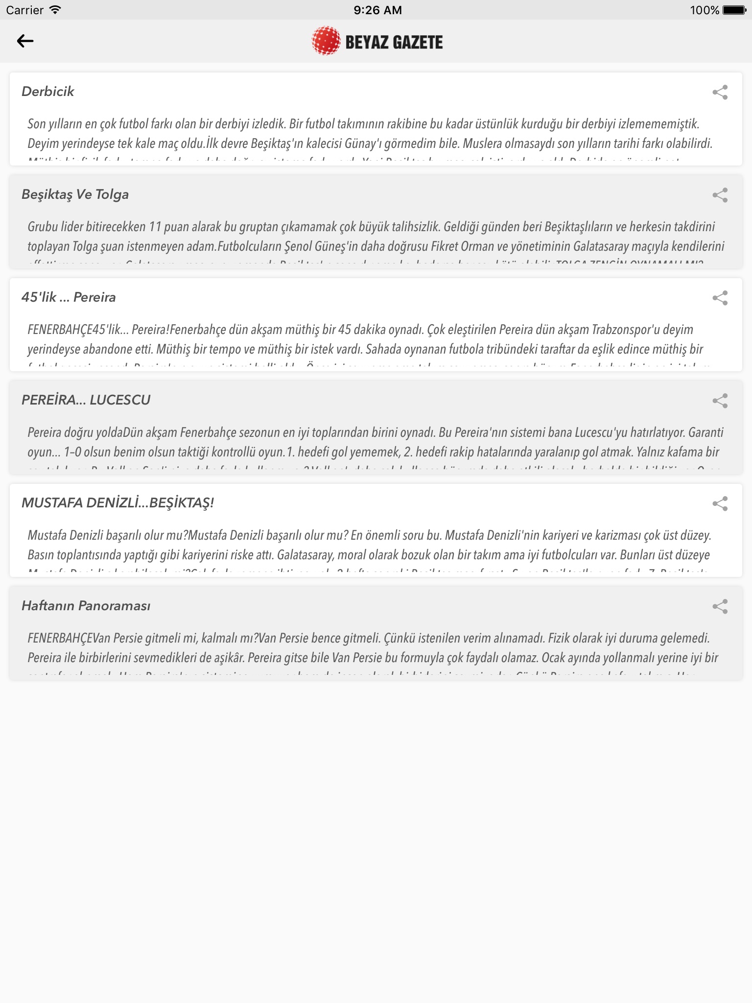 Yeni uygulamamız sayesinde Beyaz Gazeteyi dilediğiniz her yerde takip edebilir, haberlerimize anında ulaşabilir, yazarlarımız ve yazıları hakkında tüm bilgilere anında ulaşabilirsiniz. Yanınızda bulunan mobil cihaz sayesinde istediğiniz an haberlerimizi okuyabilir, izleyebilir ve favorilerinize alabilirsiniz.