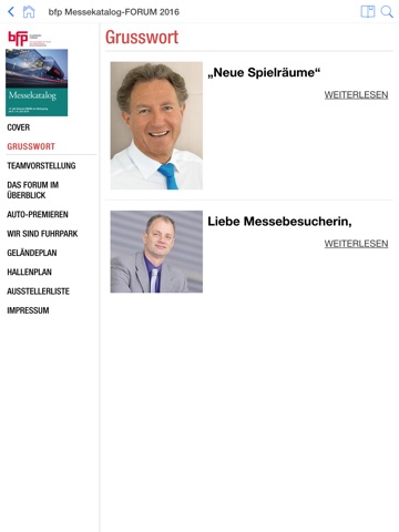 Der Messekatalog zum bfp FORUM erleichtert Ihnen die Orientierung auf der Messe. Finden Sie zielgerichtet Aussteller der Messe und entdecken Sie deren Angebote. Das Verzeichnis des Messekatalogs gliedert sich nach Alphabet und Branche. Ein Gelände- und Hallenplan ist ebenfalls in der App vorhanden.
