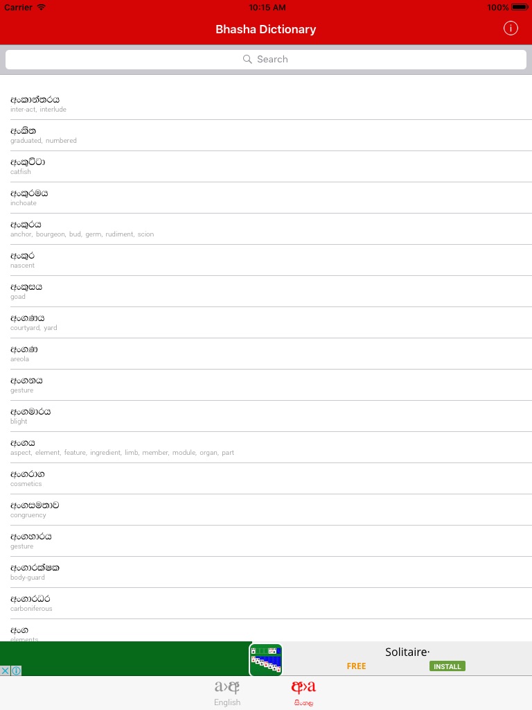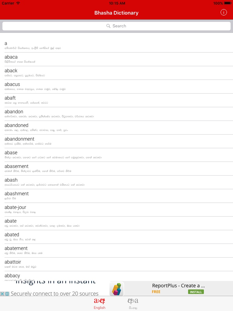 Bhasha English-Sinhala Dictionary provides you offline dictionary service for English to Sinhala word translations where you do not need any Internet connection to use the dictionary.