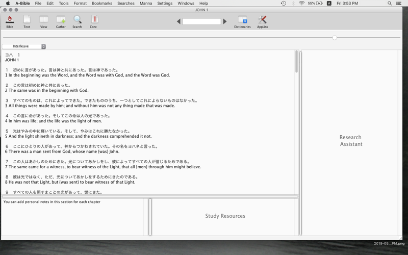 "A-Bible" (Asia Bible) is Bible Study software that tightly integrates English, Japanese, German, Chinese, Finnish and original language Greek.