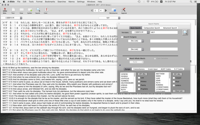 The versions included in this download are: the Kogoyaku 1955, as well as KJV (King James) , ASV (American Standard), Emmaus Publishers NT, Tsukamoto NT, Bungoyaku NT, Chinese Union version (both in Simplified and Traditional) and Finnish 1938. Other versions are available for separate purchase - see below.