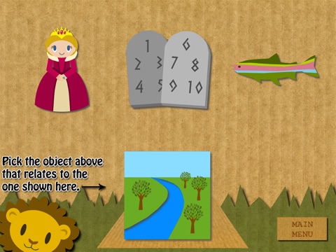 An object, person, or place is featured and displayed along with three others, one of which is related somehow. Some are simple relationships, such as a fish and a river, while others require some story knowledge, such as pairing Moses with the burning bush.