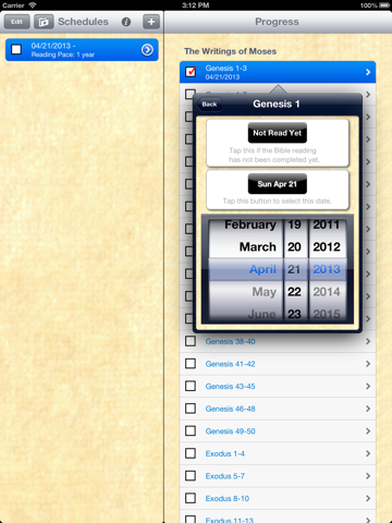 If you need to change the date for any entry, you can "drill down" into the days Bible reading and set any chapter to any date, or even remove the date to indicate the Bible chapter has not been read yet.