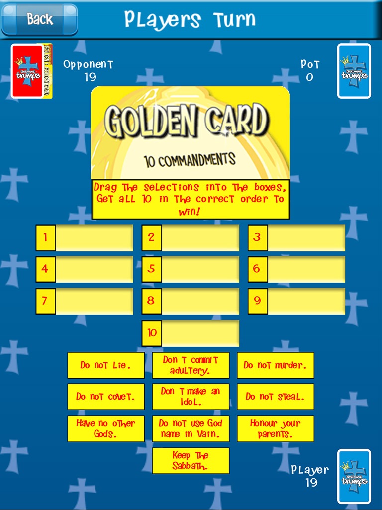 > Golden Cards – special trump cards where you challenge opponents to remember things i.e The 10 Commandments or Plagues on Egypt