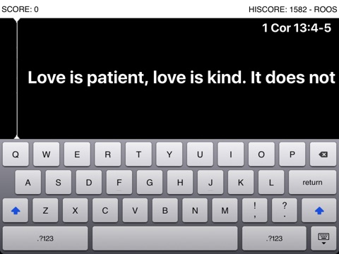 A Scripture, a passage from the Bible, is scrolling from right to left. You have to type that Scripture before the first letter hits the energy bar on the left.