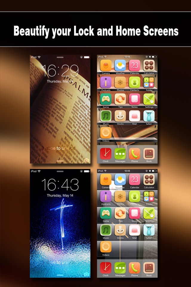 Bible Wallpapers is a great app to design Bible-based backgrounds and lock screen for iPhone. Put the Bible into your daily life and keep in mind what the Word of God says, every time you look at your device!