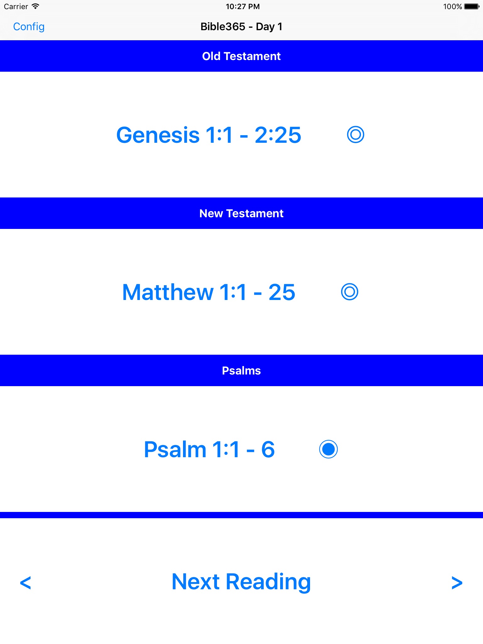 Bible365 provides daily readings to enable you to read all the Bible in a year. It links to BibleGateway to load each of the referenced passages into a web page for you to read. Once you have linked to a passage, Bible365 remembers for you which passages you have already read.