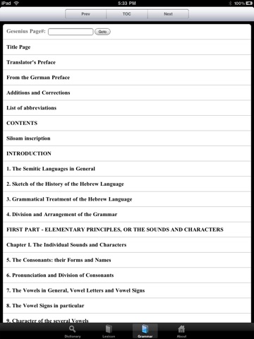 3. Grammar: Gesenius Hebrew Grammar is the standard Biblical Hebrew reference grammar in English. A complete copy of this grammar is accessible from within the application.