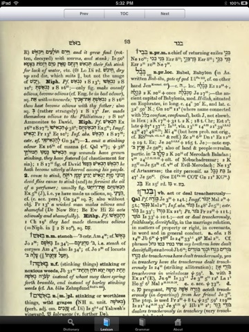 2. Lexicon: The Brown-Driver-Briggs (BDB) Hebrew Lexicon is probably the most commonly used Biblical Hebrew Lexicon. A complete copy of this lexicon is accessible from within the application. In additon, individual pages can be displayed via the Dictionary word lookup functionality.