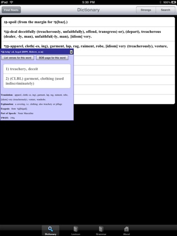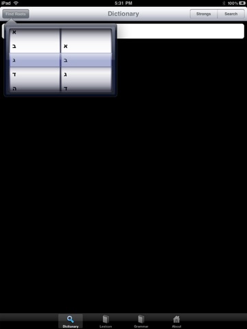 1.a. Roots: One of the really beautiful aspects of the Hebrew language is that all of the roots of the verbs and nouns are derived from two-letter units that are usually assembled as part of a three letter root. By selecting the first two letters of the root, a listing will be displayed of all Hebrew and Aramaic words (Aramaic words will display in green in the summary) that begin with those two letters with a brief English translation. Once the list is displayed, tapping on a word will display a popup with further detail about the selected word. It is also possible to display a list of all the verses in the Hebrew Bible that contain that word or the BDB page for that word.