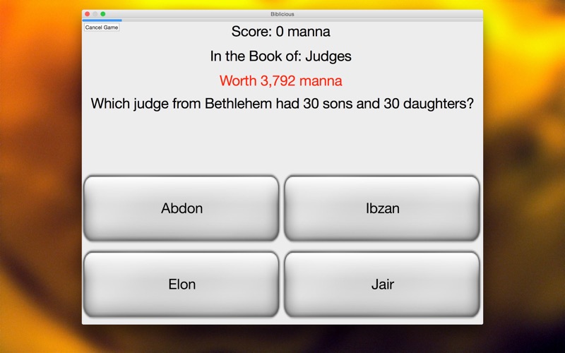- Choose from Old Testament questions, New Testament questions, or questions from the entire Bible.