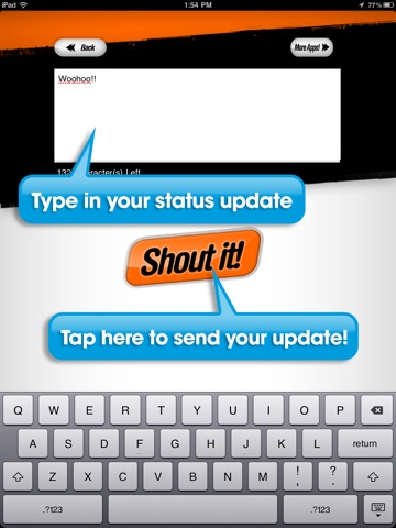 5. Type in your status message in big textbox by using the keyboard. Press Shout It!.