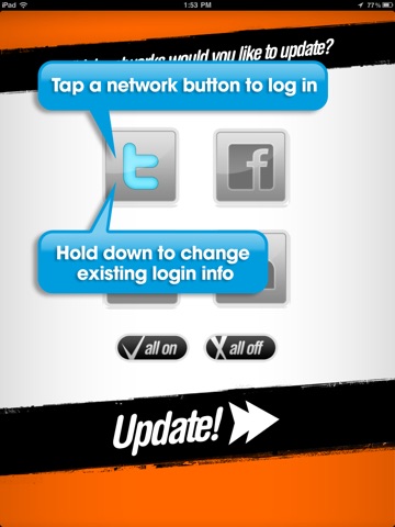 2. Tap the social network buttons to select/login to the networks you would like to update with your new status.