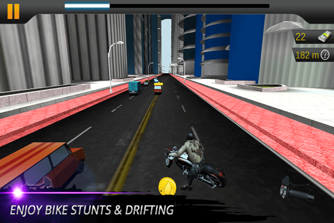 Get more coins to get more heavy bikes. Every new bike is more advanced and heavy than the previous. Enjoy 2 scenes of racing for now. Scenes includes city racing and high way racing.