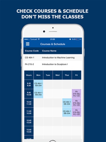 Check your Schedule, Moodle, Syllabus, Grades, Transcript, Scheduled Exams, Attendances, Food List, Bus Schedule and Academic Calendar. Mobiversite guaranties that user ids, passwords and other information related to your personal data are NOT kept.