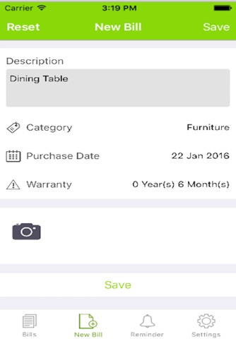 Capture bills through the phone camera and put a short description, category, purchase date and warranty period.