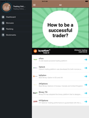 This is what you need: a useful app with tens of review of Best Trading - Binary Option Apps and services with ETFs, Stocks, Indices, Commodities, Currencies services, where you can find what you need.