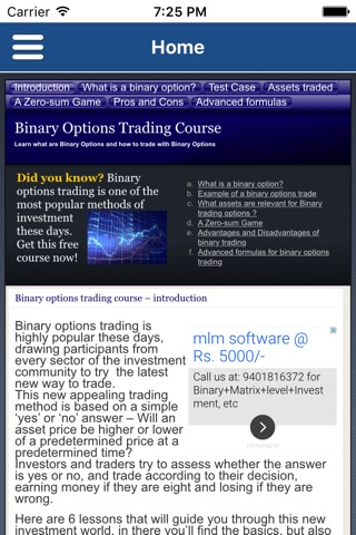 Learn in this 6 lessons course the terms and concepts, the way of trading binary options, pros and cons of binary options trading and advanced formulas to invest strategically.