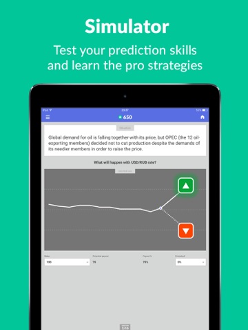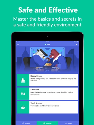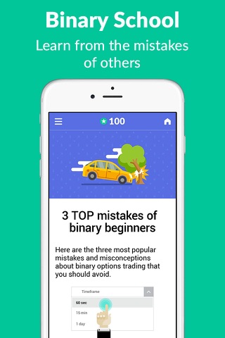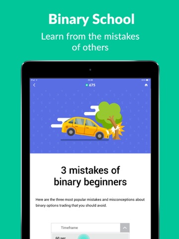 The Binary School app is constructed like a game where you can earn points every time you complete a school chapter. When you collect a certain amount of points, you can unlock the special Simulator section where you can practice your price prediction skills on different situations involving stocks, currencies and other instruments applicable to binary options.