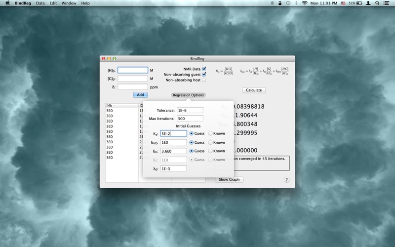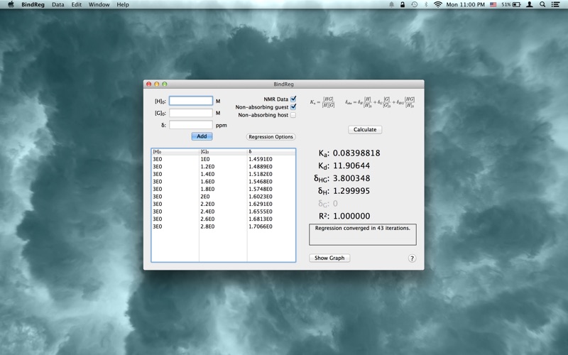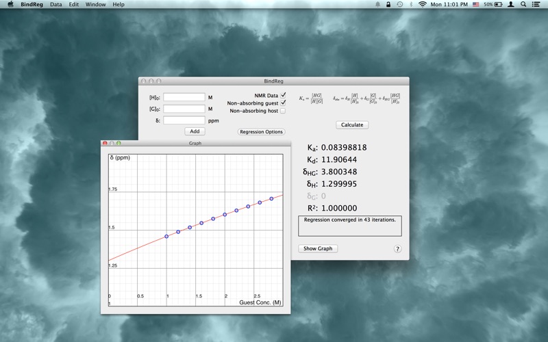 BindReg calculates the binding constant for a given set of data from NMR, UV/Vis, fluorometric, or other associated binding titration experiments. The application uses the Levenberg-Marquardt algorithm for nonlinear least squares regression and provides a graph of the fitted curve in addition to the resulting parameters from the regression. At this time, BindReg only supports 1:1 host-guest complexation.