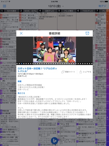 TV Bing Japan provides the best Japanese TV Guide experience for the iPhone and iPad users in Japan, enabling the users to get connected using TV as the glue. TV is one of the most popular topics for people to tweet about. TVBing enables iPhone users to browse the best-looking Japanese TV guide in the familiar UI and allow them to submit and view tweets about the TV program and to share your comments about the TV program with your friends in Facebook. Ultimately TVBing helps the users to get connected with each other, exchanging information about TV programs.