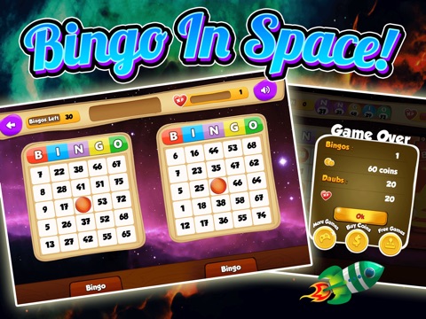 Slick controls let you switch between cards easily, daub called numbers & call out Bingo! as soon as you have it to win the game! BUT! Becareful not to call out Bingo if you dont have it. You will freeze and lose precious time. The clock is ticking! Do you have what it takes to play up to 4 cards? Do you dare take the challenge? Discover now with Bingo Cosmic!