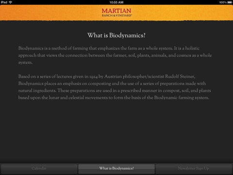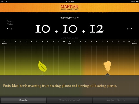 Put the beauty of Biodynamic farming at your fingertips; ideal for those who currently practice Biodynamic farming or gardening techniques or for those who just want to know when to pop open that special bottle of wine. Biodynamics is a holistic approach that views the connection between the farmer, soil, plants, animals, and cosmos. The Bio Calendar app works as a visual tool that helps you easily track days for sowing, pruning, and harvesting a wide variety of crops including vineyards, vegetables, and fruit orchards. It has the added benefit of identifying fruit days, which are ideal days for tasting wines. With up-to-date hourly tracking of the various Biodynamic cycles, managing your agricultural crops under the guidance of the Biodynamic calendar becomes as easy as the click of a button.
