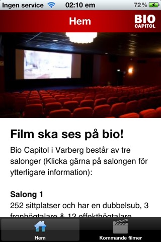 Bio Capitol in Varberg is an independent, privately owned cinema with three screens. We offer besides movie experience even live opera and theater performances. With the app, you can view our current movie showtimes, view trailers and soon book tickets.