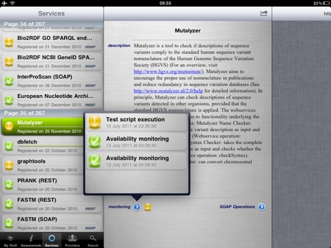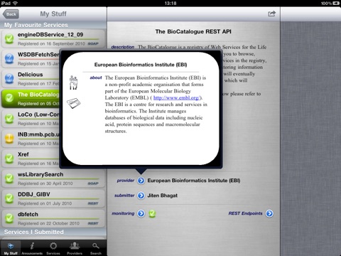 This app allows you to browse the catalogue for services, service providers, other BioCatalogue members. In addition to this, you can sign into the BioCatalogue registry through the app to view:
