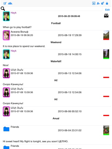 BiPager is closed cross-platform & multilingual messenger with translator for storing and sharing your thoughts and photos with your Friends. Register your email address and chat with your Friends in your native alphabet, take/choose a picture to attach it to your Photo message and broadcast it to chosen Friends, simultaneously building your online photo album. BiPagers keyboard currently supports 3 alphabets: Latin (English, Spanish, French, German, Portuguese, Italian, Norwegian, Danish, Finnish, etc.), Cyrillic (Russian, Ukrainian, Belarusian, Serbian, Macedonian, etc.) and Armenian.