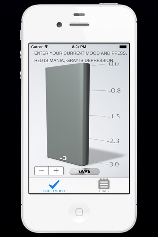 The Bipolar-Daze MoodTracker allows you to track your moods and look for patterns any time you choose. Just select your mood, on a double 10 scale (one for mania and one for depression) and click save. You can then browse your results at any time.