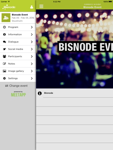 Bisnode Event is a platform for all Bisnode´s ongoing events. Through this application, participants can receive information about the event, such as program, pictures and location. Participants also have the possibility to interact with the speaker on the event, connect with social media, take notes and see other participants.
