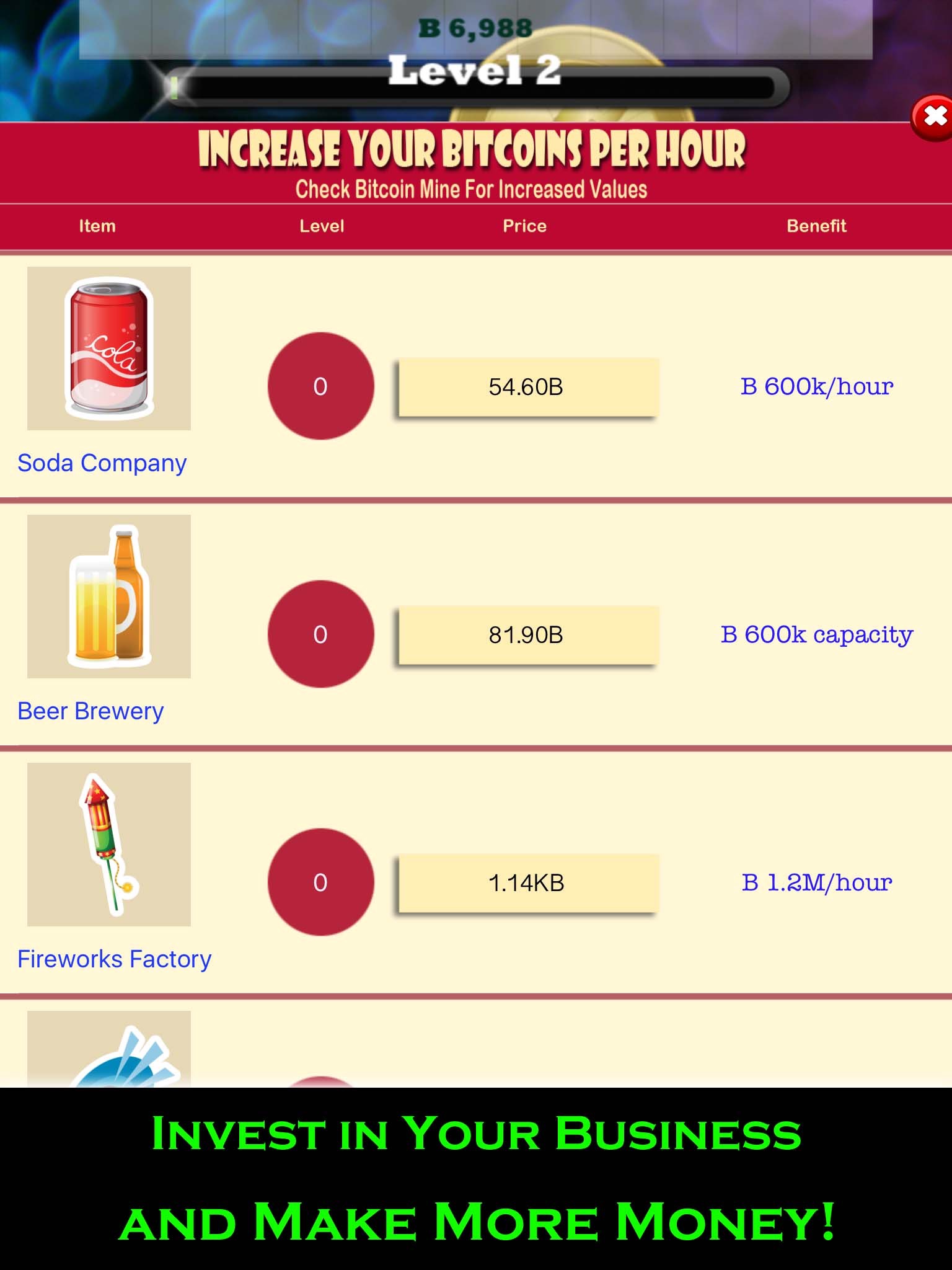 Invest your virtual mined income thoughtfully and grow your virtual bitcoin firm. Soon you will be the most popular Virtual Bitcoin Capitalist and earn billions with your smart business.
