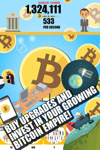 Have you ever wanted to become a bitcoin millionaire? Well, you have the chance to live that story now by starting bitcoin empire from the comfort of your phone! Simply tap Bitcoins to earn them and then buy upgrades as you earn more coins and eventually become the world’s first Bitcoin billionaire - or trillionaire - of all time!