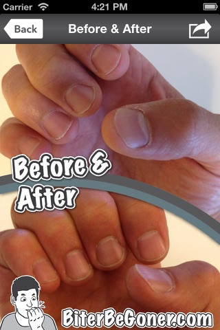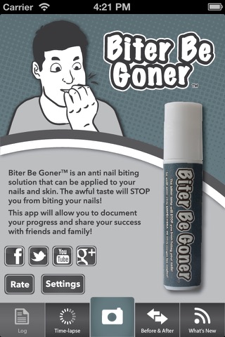 This app was developed to be used in conjunction with Biter Be Goner™ anti nail biting solution. It will help you document you progress by allowing you to take pictures of your nails as frequently as you would like. It will also allow you to easily show off your hard work to friends and family by creating time-lapse videos and before and after spreads.