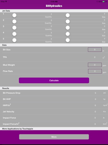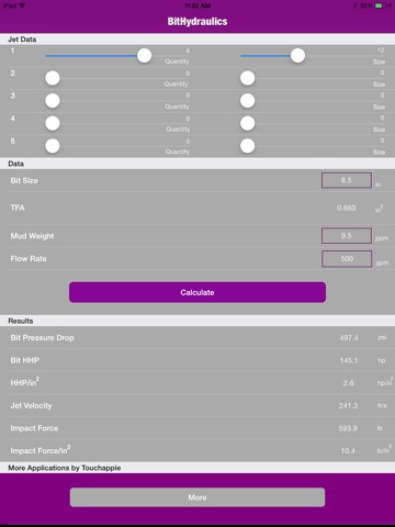 BitHydraulics calculates detailed hydraulics for oil well drilling bit including jet impact force, jet velocity, horse power, pressure drop. The user provides numbers for fluid density, flow rates, TFA, and bit diameter, and BitHydraulics then calculates the respective hydraulic parameters for conventional drilling fluids.
