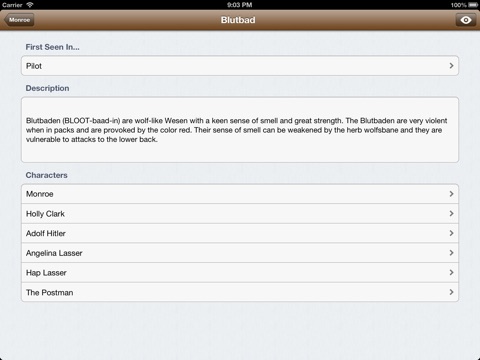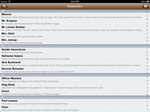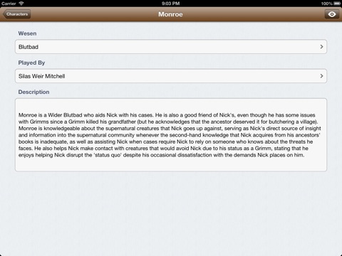 NBCs "Grimm" is one of the hottest shows on television. Fans of the show now have a simple companion guide at their fingertips. As you watch the show use this SPOILER-FREE app to read about the characters and creatures of Grimm. What was the name of that Hexenbiest from episode 3? Whats Monroe up to in Season 2? The answers are all here. With characters listed in a Contacts-like interface, its easy to search and find details on Nick, Hank, Juliette and all your favorite Grimm characters.