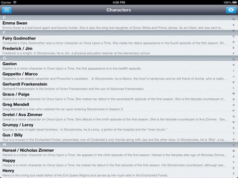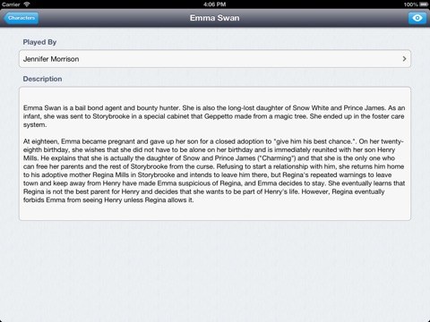 Hi, I love this app. Its my fav app. You have all information from the tv show Once Upon A Time. Its perfect for every Oncer / Once Upon A Time Fan. You can see there anthing and read about the episodes, the actors, the characters and you can watch videos!! (If you have Instagram you can follow me: ouat_bluefire) Greetings, Bluefire