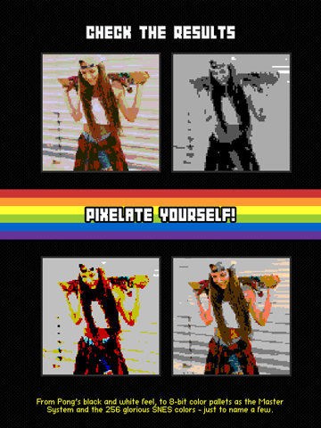From Pong’s black and white feel, to 8-bit color pallets as the Master System and the 256 glorious SNES colors - just to name a few. Explore all the possibilities and easily share them on Facebook, Instagram or Twitter.