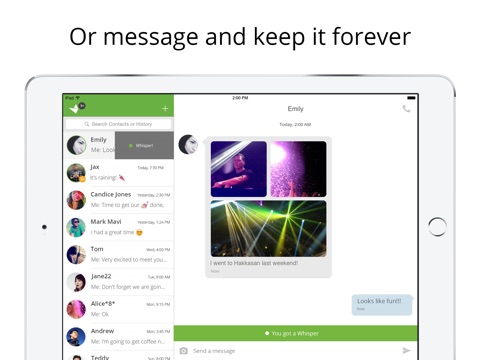 With Bleep, you can chat via text, make free voice calls, or whisper. What do we mean by whisper? Chat history can be convenient, but some conversations should never be saved. Sending a whisper to a friend means your messages disappear as soon as they are read. Whisper it, read it, and move on.