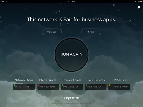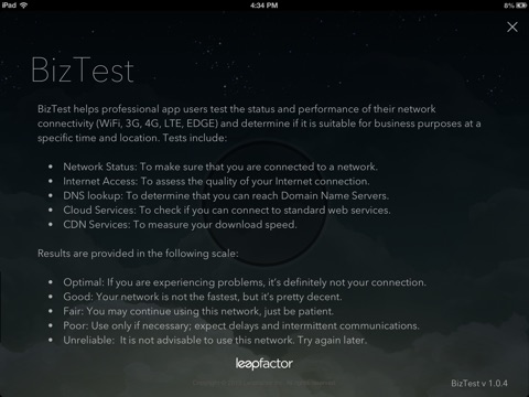 BizTest helps professional app users test the status and performance of their network connectivity (WiFi, 3G, 4G, LTE, EDGE) and determine if it is suitable for business purposes at a specific time and location. Tests include: