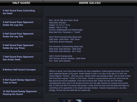 This app will get your half-guard game changed forever. Andre covers all the fundamentals of the top and bottom game and shows his most efficient moves. One of the most complete videos ever produced on the half guard.