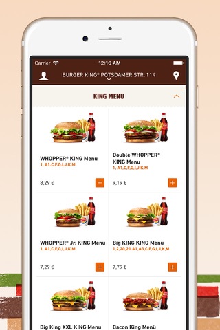 App herunterladen, Postleitzahl eingeben und prüfen, ob auch zu Dir geliefert wird. Wähle Deine Lieblingsprodukte aus dem BURGER KING® Angebot und lege sie mit einem Klick in den Warenkorb. Bezahlungsart wählen, Bestellung abschicken und schon ist Dein Essen auf dem Weg zu Dir!