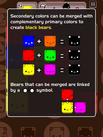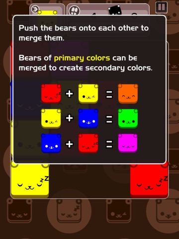 Simply slide your finger up, down, left or right to move colorful bearies on the game board When primary color bears (red, yellow, blue) collide with each other, they fuse to become secondary color bearies (orange, green and purple), when they collide again with complementary primary color bearies, black bearies are formed. When black bearies collide with each other, they level up! The higher their levels, the more points you score!