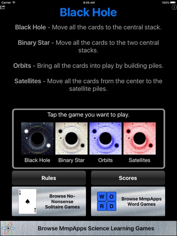 BLACK HOLE SOLITAIRE is an extremely challenging game where every deal is solvable.