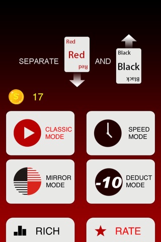 The only thing you need to do is to seperate the black and red poker cards in a limited time,black upwards and red downwards. At the same time, its a crazy game. You need to concentrate , or it would be game over. Of course, move as fast as you can , time not waiting.