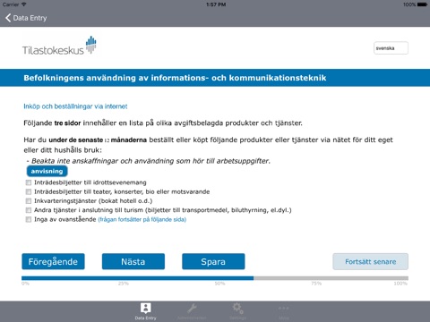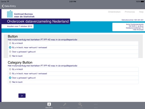 For online surveys it is required to have an internet connection during the duration of the survey, since the survey is running on a Blaise server park in this case. The app sends the answers to the questions to the server and the server calculates a response based on the given answers and the rules and checks that have been defined for the survey. The response is send back to the app and displayed to the user.